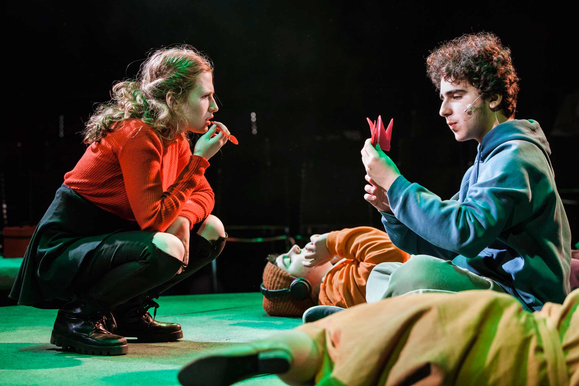 אני מנסה להיזכר איפה התחלתי לבכות. זה לא בגלל הסוף העלילתי, ברק, ברוטינת הדלת המסתובבת, חזר שוב למחלקה. שוב מהתחלה, משלב א', עם פיג'מה ואז היה שוב דיון באם יש הצגה, של המשוגעים, כמו במרה/סד, או אין. נראה לי, אם אני זוכרת טוב, שהמעיין התחיל לנבוע דווקא כשברק עלה על המיטה ואמר, אני נועם, בן 16 אני לא ברק אולי קצת ברק… ואז אלמה היא נטע בת 18, רות בת 16 היא בת שבע וסולו בן 13 הוא עמנואל – לא על הספקטרום, אם כי כולם על הספקטרום ולבסוף סופיה בת 15 היא תום – דיספוריה מגדרית היא לא הפרעה נפשית. ואז כולם עולים להצגה, שמתחילה עם שגיאת האריה…. כמו בסרטים של MGM… איפה המציאות ואיפה ההצגה. למה בכיתי לא יודעת. משהו שם היה כנראה מאוד נוגע ללב. בכלל השחקנים הצעירים, בני גילם של הדמויות ולא שחקנים בוגרים מתיילדים, זה עושה משהו, למרות שכולם כבר בעלי ניסיון רב לפי התוכניה. כולם לומדים בתלמה ילין, גם שני הנגנים על הבמה, אדם חן על הפסנתר ועלמה בר סיני בצ'לו, הם מתלמה. וגם הם לובשים פיג'מות ירוקות. גם הסדרן בכניסה לבש חלוק לבן, כמו רופא, או סניטר. מחוץ לאולם זה נראה לא ברור, אבל בפנים ממש חלק מהצגה. פנים וחוץ, מציאות ומשחק. המחזה הזכיר קשר בכמה קלישאות שחוקות, בהה. אבל אז היה קלאש אמיתי, רגע קסם.