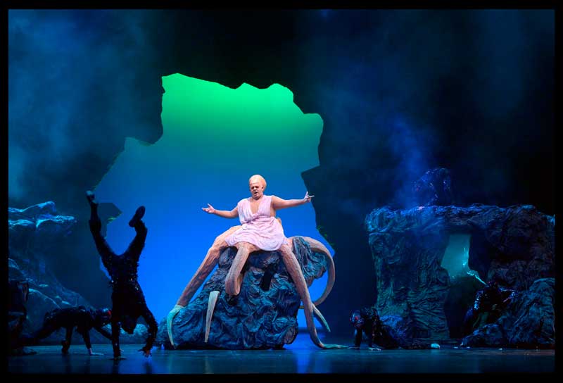 אם בדון ג'ובאני נכנסנו למוחו הקודח של הגיבור דרך בית מבוך מורכב ומסתובב, כאן אנו כנראה בסימן עקרב וכל העומקים הנפשיים, כמו גם ההתרחשויות העלילתיות מתרחשות בים, או לחופיו, גם אם במקור הן אמורות להתרחש בארמון. למשל בסצנת האוהבים המסעירה של דידו ואיניאס, הזמרים יורדים אל בין פיסות בדי התכלת. ים רוגש, אהבה סוערת. ככה רוצים שנבין. אולי דימוי מעניין, הביצוע, להבדיל מזה של דון ג'ובאני, הוא קצת מביך עקב הבחירה כאמור בפסי בד בגווני תכלת שונים ובגבהים שונים לייצוג הים. אמנם פה ושם יש הברקות, כמו הצגת ים שוקט על יד הרעדה קלה של פסים שוכבים, או משיכת פסי הים על-ידי המלחים לקראת עלייתם על הסיפון וכמובן הים השמלה בסצנת קינת דידו, שמזכיר לי בשלב כלשהו את שמלת הווידיאו של נציגת אסטוניה לאירוויזיון (או של ריטה ביום העצמאות שעבר) ואח"כ את מה שעשו בהצגה פרידה בהבימה, עם הטביעה שלה בבד. ובכל זאת, הבחירה באלמנט כזה, שזועק low budget בלי הצדקה רעיונית בהפקה שבהחלט אינה דלת תקציב מעלה תהיות. מלבד הים והספינה, יתר הסצנות מתרחשות על סלעים בגדלים שונים, שבדומה לתפאורה שלהם ללה צ'נרנטולה, גם היא מרפרפת למרבה הצער לתפאורות עבשות ומיושנות כמו שאנו רואים לפעמים בהפקות משנות ה-60 עם ג'ואן סטרלנד בקובנט גרדן, סגנון שהיינו בטוחים שכבר פס מהעולם. ומעבר לזאת, אולי ההצבה של דידו על סלע אחד ושל בלינדה המשרתת שלה על אחר משני עברי ים, עשוי להעיד על מצב נפשי מסוים, בידוד של המלכה. אבל אז מופיע לו איניאס לבדו ומסצנה שבמקור היא מפגש של שתי פמליות של מלכים, אנו מקבלים זוג אוהבים בודד על סלע. זה אפילו נראה כמו אהבה אסורה. מעבר לזה שהפרשנות הזו כבר חורגת כמעט מגבול הטעם הטוב, מבחינה וויזואלית זה פשוט מגמד ומקטין את הזמרים ואת הדמויות. נראה לי שחוץ מסצנה המרשימה של המכשפה התמנון על הסלע, הצבות הסלעים לא תרמו לשום דבר בהפקה הזו.