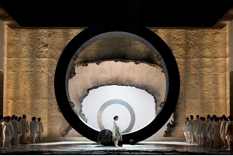 חדר שלם רק לרשימת הפרשנויות על-בסיס פאוסט במוזיאון גתה ועדיין הבמאי ראה לנכון לצמצם את האופרה לכדי עיגול. אלמנט מעגלי שחור ענק, טבעת, התופסת את כל שטח הבמה כמעט והמהווה את כל התפאורה, למעט כמה רקוויזיטים קטני ממדים יחסית וקוליסות שחורות עולות ויורדות על שלושת קירות הבמה. כוכבי משנה: ציר ההטיה של אותה טבעת – עליו היא עולה ויורדת, עומדת, נוטה או שוכבת, משתנה משער, למיכל או לסתם אלמנט דקורטיבי (כלומר סימבולי), והבמה המסתובבת, שמסובבת את אותה טבעת (וגם כמה מהמבצעים) בחלל, לפעמים היא חזות הכול בקדמת הבמה, לפעמים היא עומדת כצל מאיים בצד, לפעמים היא ניצבת מאחור כפתח לפתח אחר שנפער בקיר האחורי. אז מה זה אמור להביע. הנה מה שיגיד הבמאי: