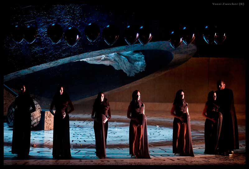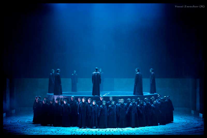וכעת למקהלה, שבהפקה זו לא רק היו צריכים לשיר, אלא אף לרקוד, כלומר להיות חלק בקומפוזיציות הצורניות שהגה הבמאי. לא פשוט, לרקוד ולשיר באותו זמן. הבעיה היא, שכאן הם רקדו הרבה יותר טוב מאשר הם שרו. בעצם ברוב הקטעים המקהלה היתה חלושה מדי ומפוזרת ורק לעיתים בקטעי הפורטה משום מה פתאום ניכר ריכוז ועוצמה קולית במינון נכון ומרטיט, ללא קקפוניה וללא התפרעות ללא לצורך. זה רק הזכיר לנו מה אנו מפסידים ביתר הקטעים.
