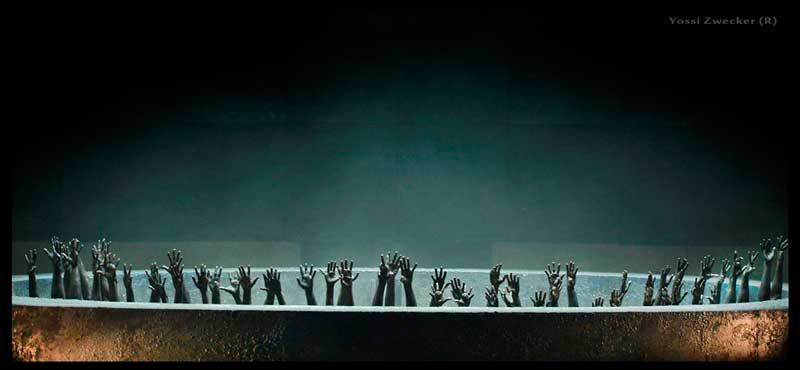 אז המסורת גורסת בלט קלאסי מסורתי וכך באמת נוהגים בהפקות אחרות של פאוסט. אך כאן, הבמאי/מעצב/תאורן/כוראוגרף הוא לא רקדן ולהעמיד בלט מודרני, או קלאסי, הוא לא יכול. לכן הוא הלך על קומפוזיציה צורנית של ריקוד בהשפעה ניכרת של כוריאוגרף סרטי הראווה בזבי ברקלי. אז קטע ה"ואלס" בסוף המערכה השנייה, שהתחיל ברקיעות הרגליים של כל המון אדם הרקדנים והשחקנים וחברי המקהלה שעל הבמה, היה אולי מרענן ומכני ובעל אמירה ומרשים (למרות שהוא נמרח קצת יותר מדי על אותו השטיק), אך גולת הכותרת הכוראוגרפית – הבלט במערכה ה-5 – היתה חזרה משעממת על אלמנטים שכבר ראינו קודם. ואני כותבת בפנקס "כוריאוגרף הוא לא". וגם העירום לא הציל את הקטע הזה. אם מישהו בכלל שם לב שהיה עירום, עם תאורה אפלולית ורקדנים צבועים באפור. אם לא הייתי מקבלת מראש תמונות מהיח"צ, כנראה שלא הייתי שמה לב לזה בכלל… אני מצפה לוואו, מודיעים לי חברים שזו הולכת להיות גולת הכותרת של הערב… ובמקום זה אני מקבלת רקדן עירום נישא על-ידי רקדנים אחרים, מועבר מעליהם לאורך כל רכבת בני האדם והנה עוד אחד אחריו, אחד יורד בסוף ומעלים עוד בהתחלה וחוזר חלילה כך שתמיד יש שניים למעלה… היה משעמם… המעמד הזה היה מונוטוני, ארוך ארוך מדי ואפילו לא ניצל/התייחס למלוא הגודל של הבמה. אחר-כך הרקדנים התפרסו על כל הבמה כולה, הנה אולי זה יזוז כעת… לא עובד, כמה קפיצות, כמה הרמות. נגמר. הכצעקתה. איפה זה ואיפה חגיגות הבלט הקלאסי הווירטואוזיות שאנו מוצאים בהפקות אחרות של האופרה ביו-טיוב, למשל כאן. מה שכן, ההתחלה היתה קצת יותר מבטיחה. המון כפות ידיים נעות מציצות מבעד העיגול השכוב. האם אלו אנשי השאול הכלואים, הדמונים המאיימים להתפרץ. בסוף הם מקיפים את פאוסט ומאיימים להטביעו… אבל באמצע – האם ככה אמורה להיות חגיגה אורגזמית של פאוסט עם הנשים הכי יפות…. קשה לי שלא להשוות את זה להר אולימפוס של יאן פאבר. שם לא רק שהיתה תאוות בשרים ערבה לחיך, אלא שהמונוטוניות שידעה להתרווח ולרתק, היתה אקסטטית באותה מידה ואף יותר מהקטעים התזזיתיים והמקפיצים. אבל שם היו יכולים לבחור את מוזיקת הליווי… פה – מדביקים.
