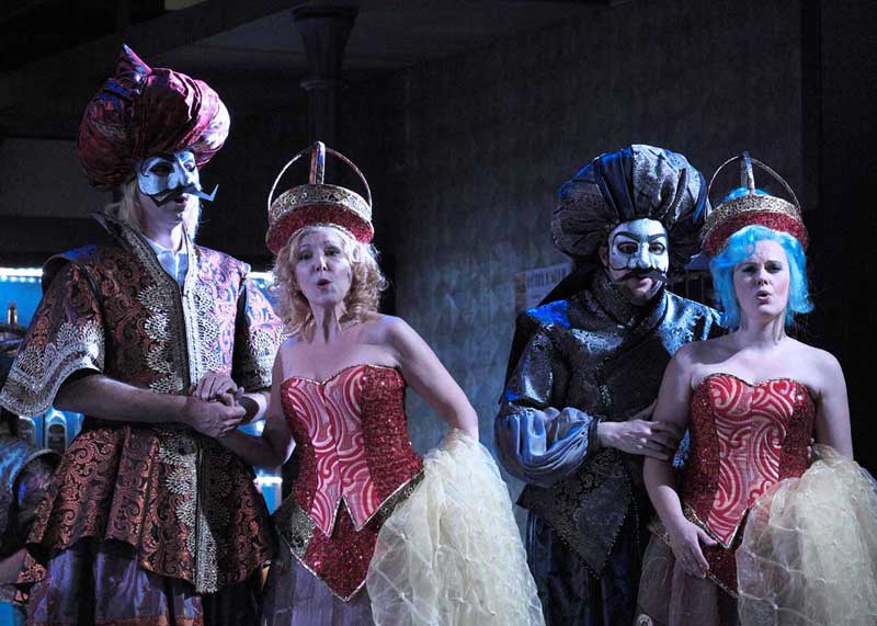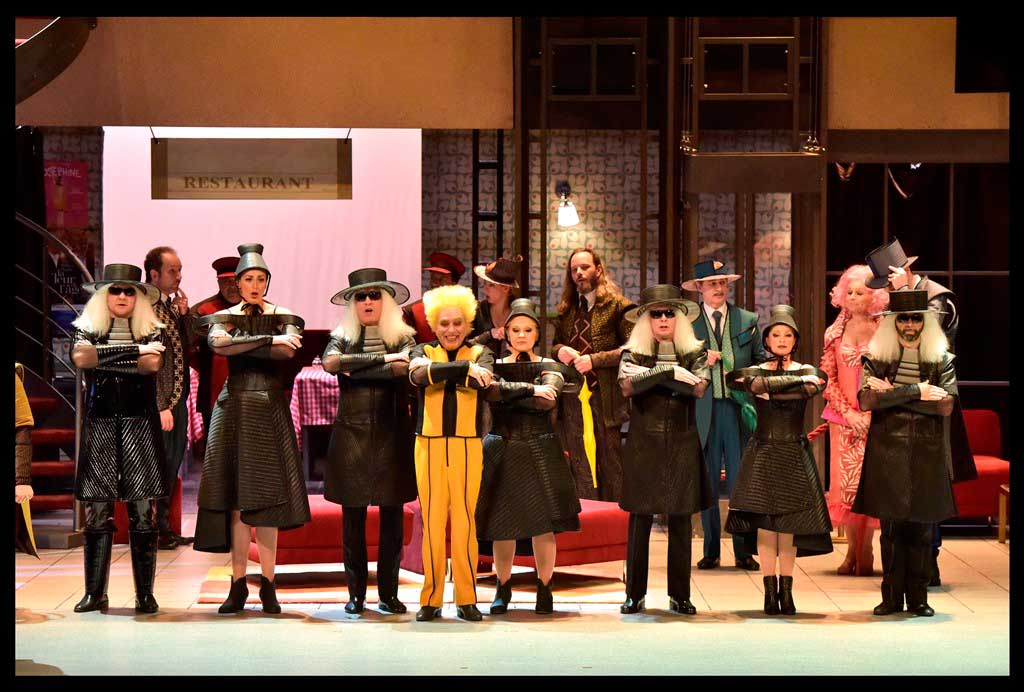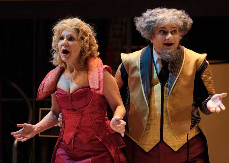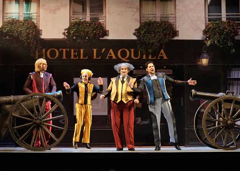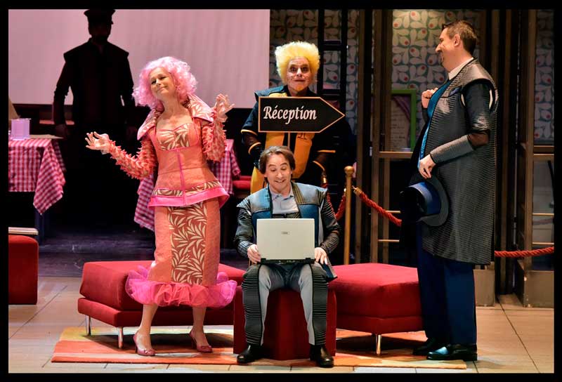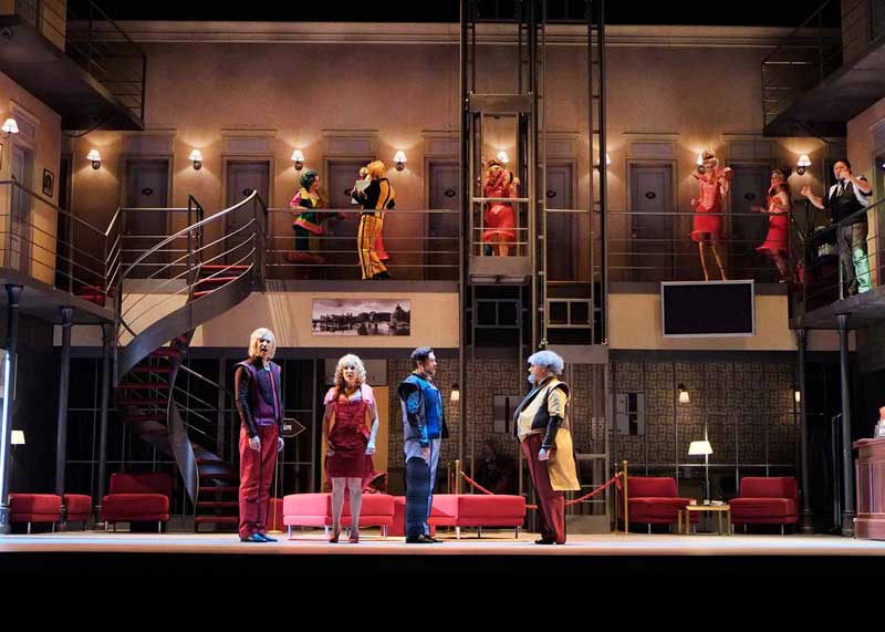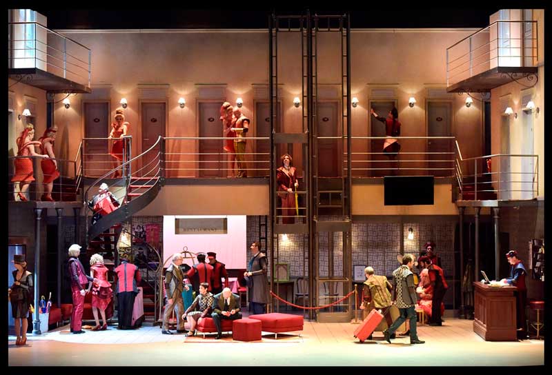 הנה לכם מקרה בו הבמאי לקח לידיו יצירה לא גדולה בכלל כאמור, בעייתית כאמור, ובמקום לחדד ולהבליט את המוזיקה שלה, שהיא החלק החזק שלה, וגם אם הוא לא מופתי הוא עדיין וירטואוזי מאוד ומבדר וחינני, הוא בחר להבליט דווקא את החלק החלש – הסיפור הקלוש והמטופש עד מאוד וגם את זה הוא עשה אך ורק כדי להראות אותו מטופש עוד יותר ממה שהוא. כאילו הוא רוצה לצרוח לנו במגפון – זו יצירה רעה. אז נתחיל מזה שבאינטרפטציה שלו המלון בו מתרחשת האופרה הוא מלון זונות והזונות לבושות אדום, כולל ליזטה, אבל לא אדום סקסי אלא אדום חייזרי עם כל מיני רצועות לא ברורות סביב הכתפיים ופרילים מוגזמים בישבן, או בכל מקום אחר שאפשר לתקוע אותם. ואחר-כך יש גם פיאות הזויות, לפעמים הן גם כחולות כמו אצל דורליצ'ה. ומה שלא נראה הזוי וחללי, נראה כמו מדים מהאייטיז, והכוונה לא למדים של הקונסיירז' במלון, אלא לבגדי הדמויות האחרות, שמשום מה איזה מעצב תלבושות החליט שיבינו שהם קשורים אם יעשו להם בגדים עם אותו מוטיב כלומר דורליצ'ה, אביה ושני מחזריה בכחול אפור, ושני האוהבים האחרים באדום. כך יוצא שבתחילת האופרה כל הדמויות נראות כמו ליצנים ומתנהגות כמו ליצנים ואח"כ הליצנים גם מתחפשים – תחילה לקוויקרים (מוטב שלא תשאלו למה… טוב, זו איזו ניסיון של רוסיני להביא את האקזוטי האנגלי לפריז) ואח"כ לטורקים (עוד אקזוטים), והכול נראה כאילו יצא מהפקת מחזה סוף שנה של בית ספר תיכון, או של תיאטרון דל-תקציב במקרה הטוב (אז מה אם זה נשף מסכות בסוף האופרה). ואם אנחנו בקרקס, כמו שהבנתם, אז בואו נלך עד הסוף, עם הומור פיזי שרק הגחיך במקום להוסיף, הגזמות פראיות ולא מובנות בתחום האביזרים (תותחים בסצנת הדו-קרב… טוב שלא ירו מהם בני אדם מעופפים) או שטיקים בנליים עד כדי גיחוך (כולם ביחד לפתוח מטריות צבעוניות בסוף המערכה הראשונה…. ווואוו). תוסיפו לזה כוראוגרפיה מעופשת עם ריקודים במעגל וריקודי רכבת מבוצעים רע ("כמתבקש מהקונספט"). והנה מסך שיורד פתאום משום מקום ועליו הקרנות שחור-לבן ברזולוצייה נמוכה (מה הקשר לקרקס?) כרקע ל"מסע הקניות" של ליזטה… ושם פורטה גם צועקת לה במקום לשיר, קווינטט עם 4 דמויות למטה ואחת על הגזוזטרה בצד (ואז בתמונות ובווידיאו רואים רק 4 זמרים וחושבים שזה קוורטט, זה לא)… טריק מעליות זול וגם מקקים – כלומר ליזטה ואח"כ פיליפו עושים סצנות לדון פומפינו שלא נסחט ויורד גם הוא עם כל בטנו הגדולה והמזויפת, אל הרצפה ומציג רגליו הרועדות אל על… כבר שכחנו, מרוב גיחוך על כל מה שקורה פה, שאנו אמורים לאהוב ולהזדהות עם הלעיימך החביב.