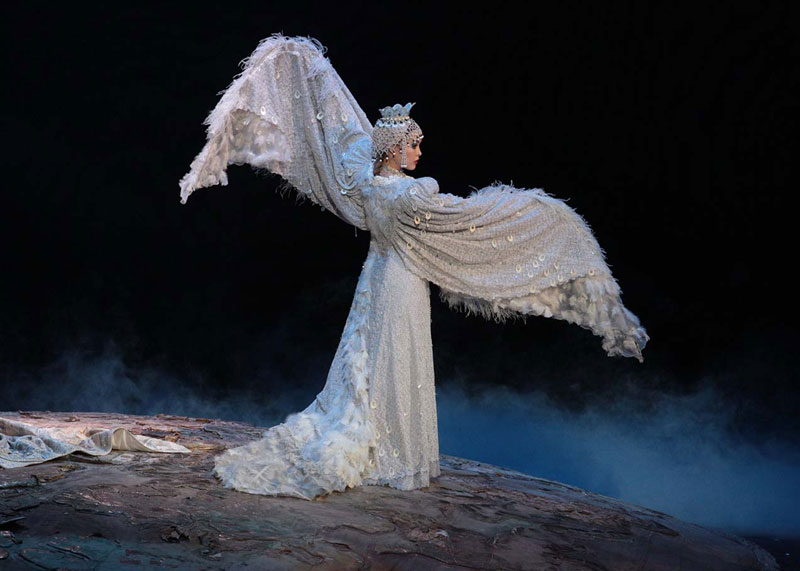 למול התלבושות המושקעות ומלאות הדמיון, עיצוב הבמה דל, משעמם ואף עבש. עיקרו הוא מעין פלטפורמת חצי עיגול לא גבוהה במיוחד שנגררת לעתים בחבלים מפה לשם על הבמה על-ידי שלושה. מאחור וילון ענק על כל שלושת הקירות של הבמה עם הקרנות מונוכרומטיות לא בדיוק מזוהות. כמה אביזרים נוספים פה ושם בסצנות השונות. יש עץ תפאורה בחצר הקיסר ויש איש עץ באי הקסום (שזו הברקה ששייכת לפסקה הקודמת), אולי כי באי הקסום שום דבר לא אמיתי ולכן גם הארמונות הם אנשים. הנה האיש-עץ נותן לגווידון ענפים כדי שיבנה מהם חץ וקשת עם מיתר שהוא חוט המשי של תליון הצלב שלו. משלימות את התפאורה, כנפים ענקיות שלעיתים הן יורדות למצב מאוזן ואז הן עננים. זה מבוצע רע וזה גם לא מעניין במיוחד. עננים עולים יורדים ויהי ערב ויהי בוקר. חלף עבר לו זמן. אני גם לא מתרשמת במיוחד מההעמדה על הבמה, שאולי אין בה מעמדים מפגרים (כמו תמונת האוטו-דה-פה בדון קרלו), והיא פונקציונלית לרוב, אך גם ללא שאר רוח, או רחמנא ליצלן, רוב הדר. ובכל זאת לעיתים יש כמה מעמדים מרשימים מאוד, כמו הברבור הלבן עם שרוולי הכנף (עוד הברקה ששייכת לפסקה הקודמת) באמצע החצי עיגול.