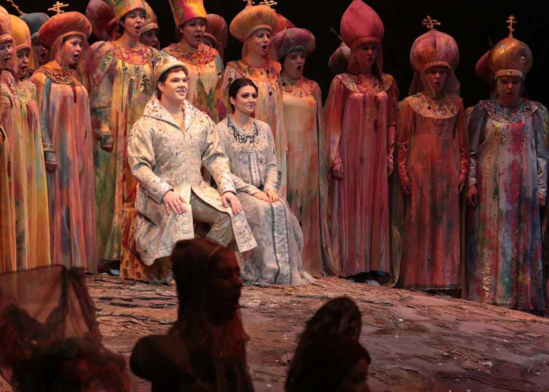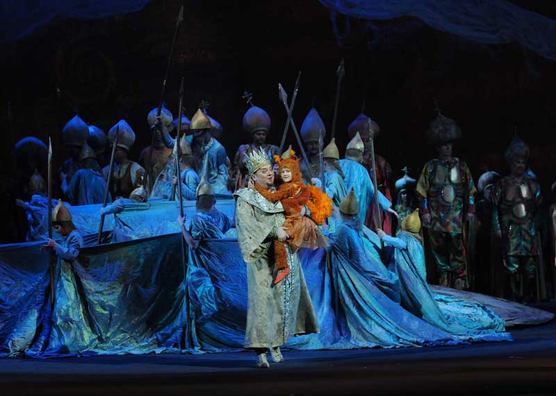 כשבאים לדבר על העיצוב כאן, אין מנוס מלהפריד בין עיצוב הבמה ועיצוב התלבושות. מצד אחד, תלבושות עשירות, מפוארות, מרהיבות. אופנה רוסית קלאסית עם טוויסט. אין ספק שניכרת השפעה של האיורים המפורסמים של איוואן ביליבין שליוו את המהדורה של הפואמה של פושקין מ-1905. הנה תראו כאן! במיוחד זה ניכר בבגדי המלחים המפוארים עד מאוד במערכה השלישית, אלא שפה יש טוויסט קומי של כובע עם פרצוף, משל היו המלחים סטים של בבושקות בשלושה צבעים שונים, אדום, ירוק, צהוב (רק שאת זה רואים רק בתמונות ולא משורה 5). השלימו את התלבושות המרהיבות, מעין כפות ענק בצבעים תואמים בתפקיד המשוטים. גם בגדי הנשים המפוארים עם כיסויי הראש המסורתיים המרהיבים, נראים כאילו יצאו מאיורי הארט-נובו של ביליבין. וכמובן אהבנו את ההברקה של הליצן הרוכב על החזיר (זה חלק מהתלבושת שלו, עם רגליים מזויפות תלויות משני צידי החזיר), את הזקן הרוכב על מקל עם ראש חמור ואת האנשים עזים שהשתרעו להם על החצי עיגול הדומיננטי שעל הבמה, לצד המלכה ועריסת הבן. ואיך אפשר לשכוח את הבגדים מלאי הדמיון של יצורי-הים, במה שאמורה אולי היתה להיות סצנת בלט, כמיטב המסורת של האופרה הצרפתית, אך הסתכמה בסופו של דבר בכמה כוכבי-ים, דגים וחלזונות אנושיים נעים בכוריאוגרפיה לא מושקעת במיוחד ובאיזו דמות במרכז על פוינט, ששיאה בשני הכוכבים מתגלגלים על הרצפה (כן, הגענו למחוזות קצת הזויים פה). אה כן וכדי לייצג את ארמונות אי הקסמים של הבן, הנה חבשו לראשם של אנשי המקהלה כובעים בשלל צבעים של כיפות בצל רוסיות אופייניות עם צלב כפול מתנשא מעל. כשהם עומדים מקובצים, אפשר לדמיין רצף כיפות שיוצר מעין חומה…