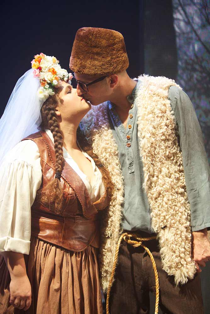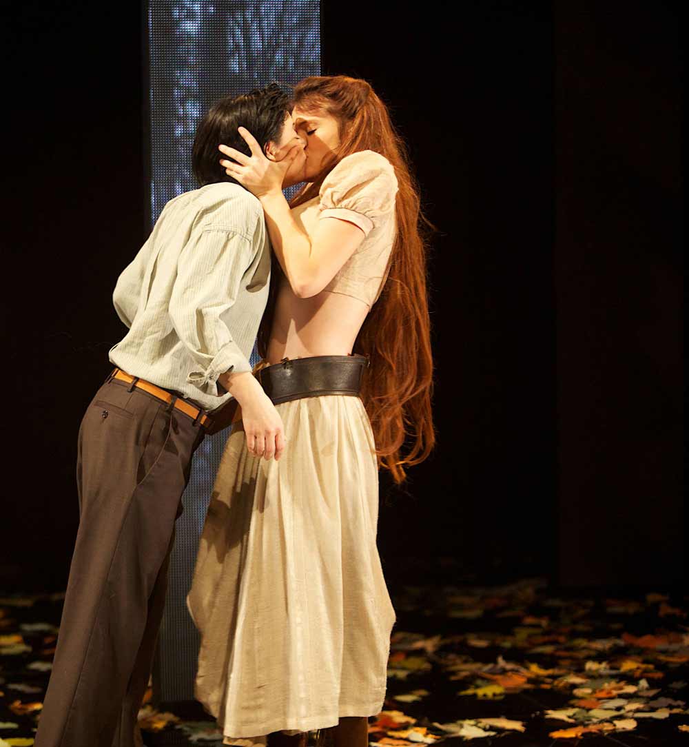 ולמה רוזלינד מתחפשת לגבר דווקא. גם זה הושמט, שכן במקור היא אומרת שקומתה גבוהה ולכן יהיה זה הגיוני. אבל אולה שור סלקטר המגלמת את רוזלינד היא בעלת קומה ממוצעת ולכן הושמט פרט קטן זה… כמו שהושמטו כל האזכורים כמעט על משחקי המגדר, כל האיזכורים מלבד הנשיקות ואיך אפשר לוותר על השיא: הנשיקה בין רוזלינד לפיבי (המאוהבת בדמותה הגברית – גנימד). וואו שתי בנות מתנשקות על הבמה ואפילו הרבה זמן. מעניין מה היה לקת'רין מק'קינון ולאנדריאה דבורקין להגיד במקרה הזה על ההעדפה הברורה של הפורנוגרפיה על פני שחרור האישה. אבל חשוב יותר, הושמט גם הקטע בו רוזלינד ובני לווייתה רוכשים את בקתת בעל האחוזה של הרועים קורין וסלביוס. בעיבוד הזה, הם רק מתארחים אצלם. והנה הפכו בעלי המאה לבני חסות חסרי כל. חבל, דווקא הפרט הזה, המראה את חוסר היטמעות שלהם ב'גן-עדן', היה יכול לתרום משהו לאיזו שהיא אמירה. אבל כנראה שהכוונה באמת היתה לנטרל כל אמירה ולשחק בשנטי בנטי.
