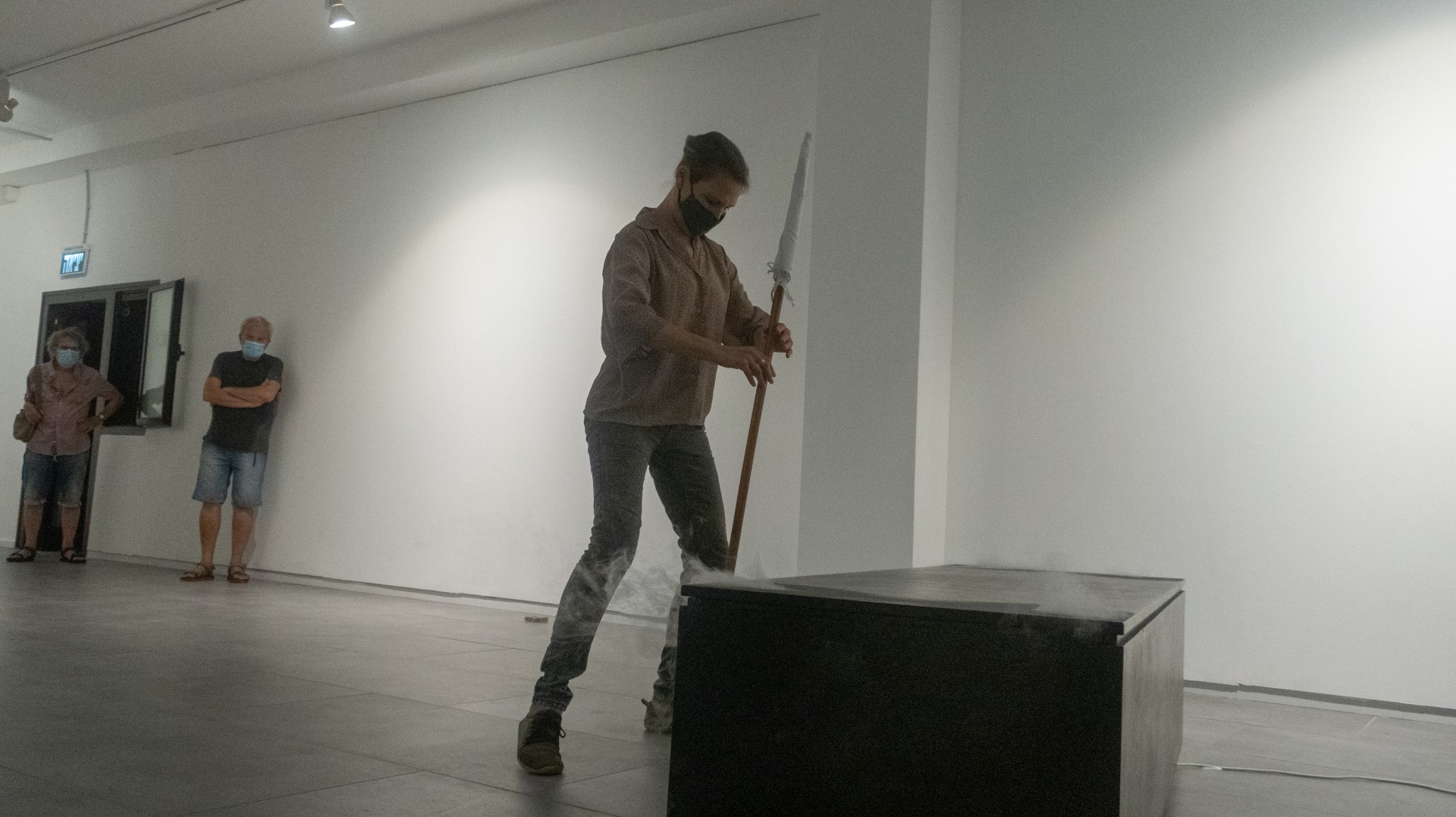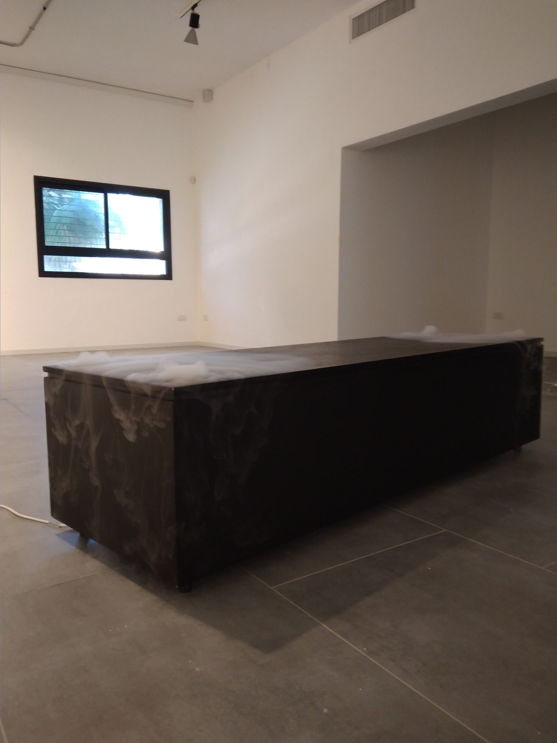 קופסה שחורה מוארכת עם ארבע פינות מעשנות. מה זה בדיוק. מזבח עם ארבע קרנות מנוקבות, ארון מתים. היא לא מתייחסת אליה ככה. זה חלק מהבית, מעמידים לצידה כורסה ושולחנון (שבברושור מכונה שידה). אבל זה גם הפיל הלבן בחדר שאי אפשר לסלק. הזיכרון. זה שקשה לעבור מעליו. שמקובע לרצפה. לא סתם עדינה מבקשת באמצע המופע מהצופים להפוך למשתתפים ולבחור את נקודת המבט שלהם, לנוע בחלל, אם ירצו. אני לא נעתי, לא נענתי הפעם, כי הייתי עסוקה בכתיבה קדחתנית בפנקס שלי, על הכיסא שלי. האם הפסדתי משהו שאני לא זזה, שאני תקועה. האם אפשר באמת לחוות הכול מכמה זוויות מבט, האם לא משנה מה, תמיד נפסיד משהו. אבל עדיין מאיפה שלא תסתכל עליו, הזיכרון מכביד. נושאים איתנו את הדגל. כבר שנים. אפילו לא מתאמצים לפתוח אותו. כולם יודעים מה זה אומר. האם לא באמת עדיף לפתוח את הדברים ולהיזכר למה.