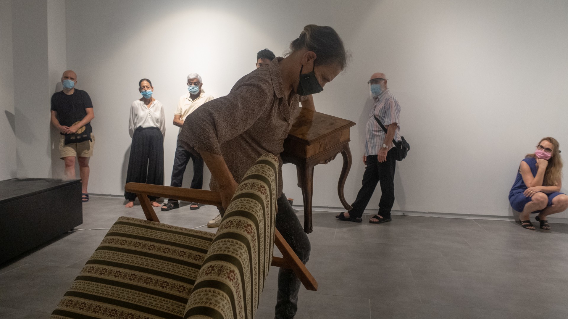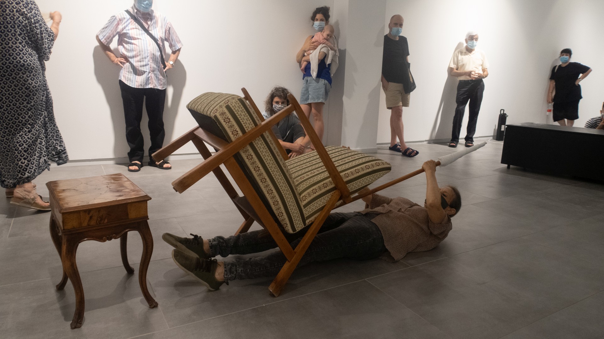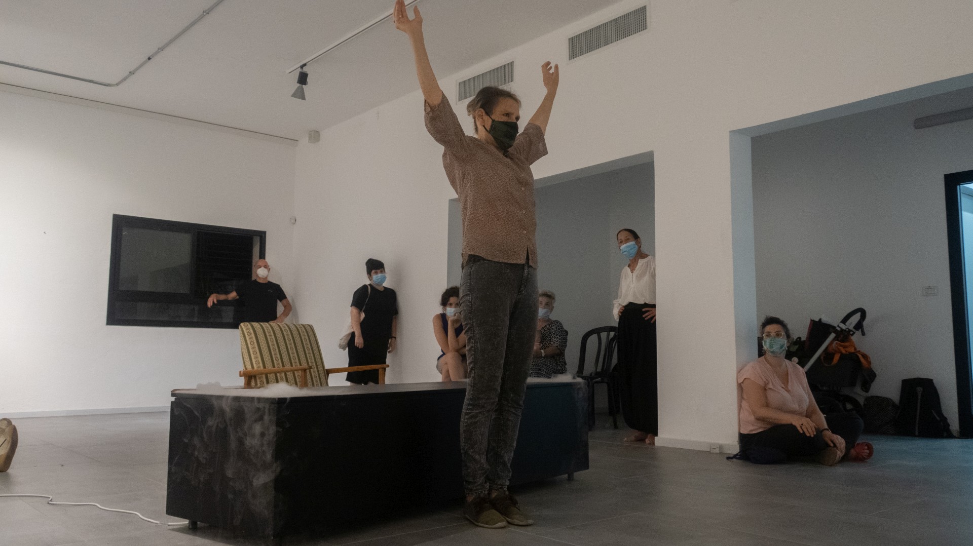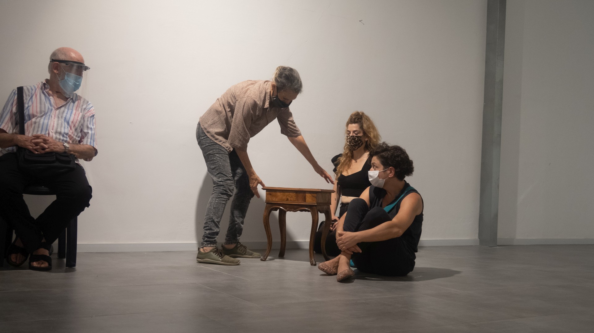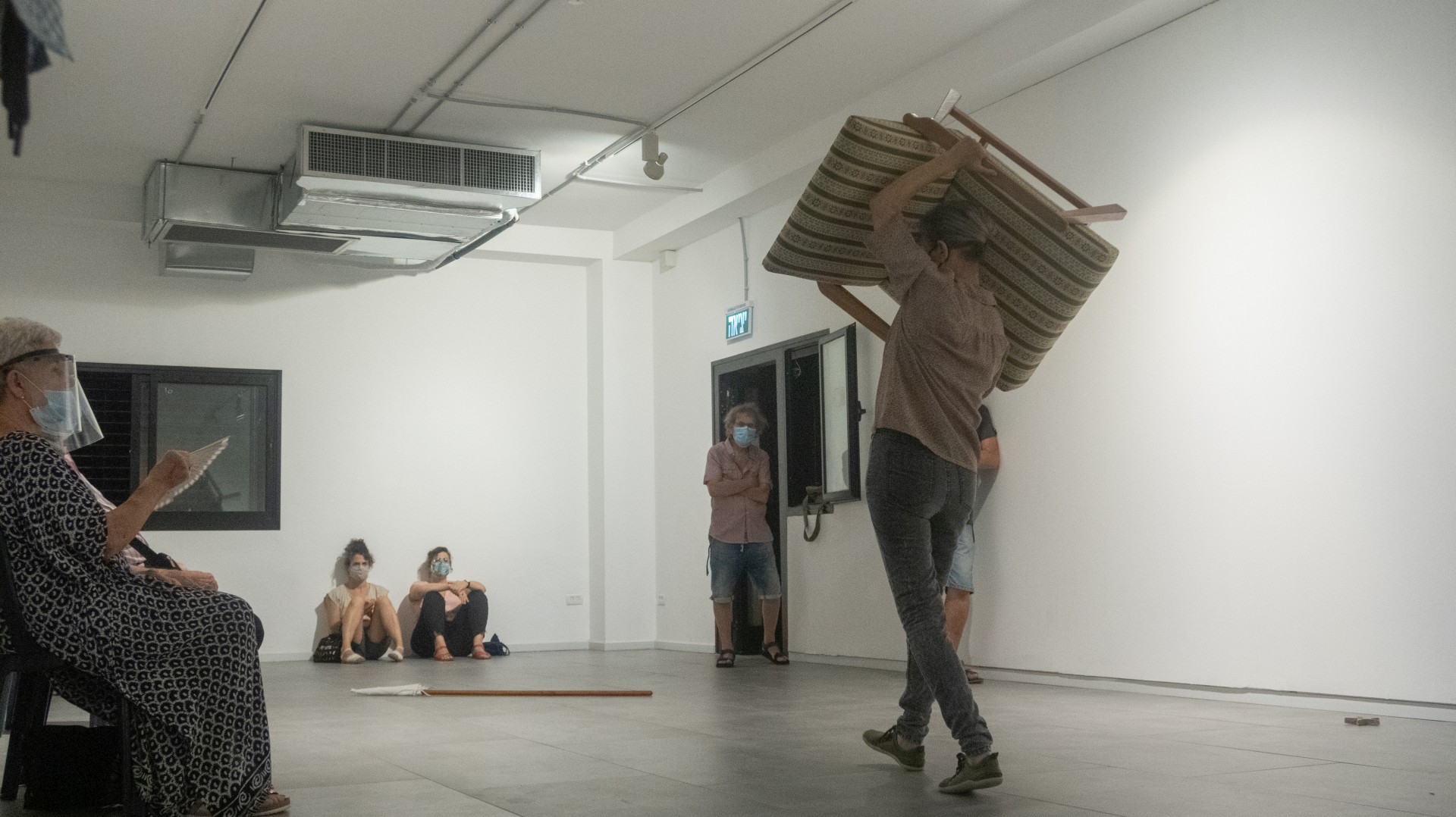 עדינה, אישה לא צעירה, עובדת כאן קשה. סוחבת משאות כבדים, כורסא כבדה, קופאת כשהיא בידיה. זה קשה לה לפעמים. היא מסירה את המסכה. איך דבר כזה היה נשמע אם הייתי כותבת אותו לא באמצע מגפת הקורונה כשכולם עטויים מסכות. גם הקהל. מחוקי פנים, לא מאופשרי זיהוי. גם התקשורת נפגעת כשלא קוראים שפתיים. אי אפשר גם לדבר, עדינה מזכירה אחרי המופע, כי יש חשש שהיא תירק עלינו. מסתפקים באנחות. בימים רגילים הסרת המסכה היא בשביל-עצמה, בשביל אנשים. כעת היא לכשעצמה. לאפשר קיום, לנשום. בעצם ההפך מ-בשביל אנשים. מאיים על קיומם אולי. לא כל דבר הוא לחלוטין אמנותי כאן. זה עוד רובד, אולי מבלי להתכוון, לדגשים שמציגים בפנינו. לחוסר הגבול בין המציאות והאמנות, לחוסר הגבולות של הזיכרון. האם באמת יש לנו יכולת לסדר את הזיכרון בעצמנו. האם זה לא נקרא לשקר לעצמנו.