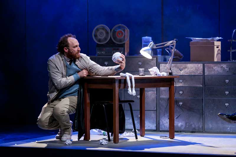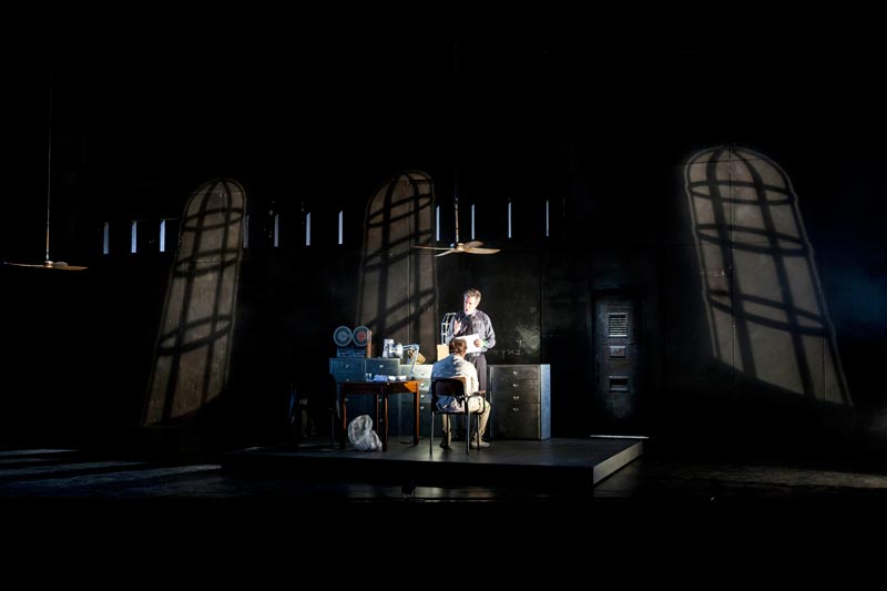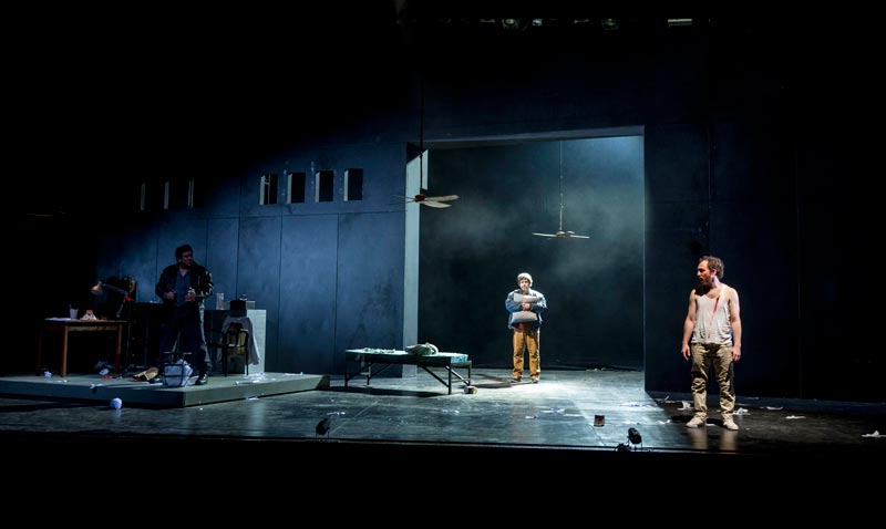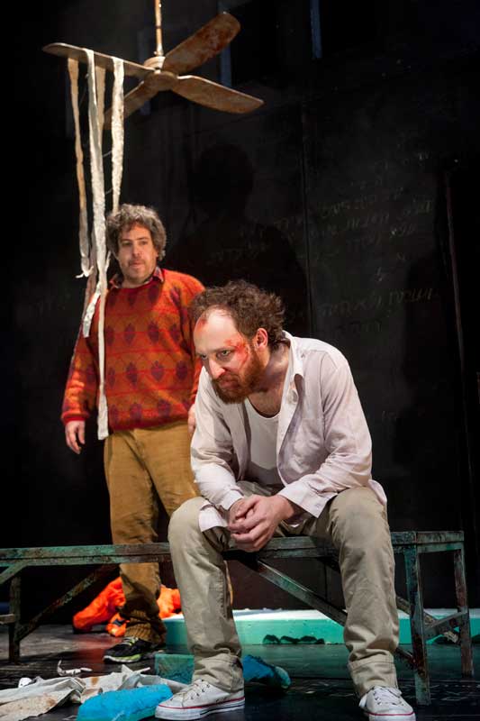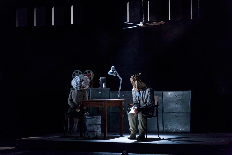 המחזה עלה בתיאטרון גשר לפני כ-12 שנה וזכה להצלחה רבה. לא ברור אם היינו בזמנים אחרים או בהפקות מוצלחות יותר. החקירה של הקשר בין המבוגר והילדי הובילה את הבמאי ארז דריגס, בהפקה חדשה זו של תיאטרון חיפה, לבחור באמצעים אמנותיים שנקשרים לרוב לעולם הילדות: מגזרות נייר שנגזרות על-ידי השחקנים על הבמה, החוקרים הקשוחים, שמייצגות את אנשי התפוחים בסיפור 'אנשי התפוחים הקטנים', פח ניירות שמוצא מהקשרו והופך למקור לצללית הכלוב (או יותר נכון לשלוש צלליות הכלובים) בסיפור 'צומת שלושת כלובי התלייה' (בביצוע מעט חלש שרק המשחק של נטע וינר מציל אותו), השימוש בראש ביצה (זה מה שנקרא בתוכנייה מסכה?), סטייל העיניים של להקת רזידנס, על ראש הילדה האילוסטרטיבית המופיעה לעיתים על הבמה וגולת הכותרת משחקי פפיר משה/תיאטרון בובות עם כדור נייר (המייצג ראש) ושני נחשי נייר (רגליים), להדגמת 'הסיפור על העיר שעל גדת הנהר', כולל סצינות קטיעת הרגל/נחש הנייר, וקופסאות טייק אווי ריקות של אוכל סיני (שאכלו קודם הבלשים), שמשמשות להדגמת המגדל והאיש הסיני בסיפור על הנער הסיני החירש שמספר טופולסקי לקטוריאן. אין ספק שאמצעים אלו הציעו סובלימציה אמנותית רגישה ומרומזת ומנעו מאיתנו חלק ממראות הזוועה הגרפיים שבוודאי היה מוצגים לנו אם היינו צופים במקום במסכים, אלא שעדיין לא היה בהם לשחרר אותנו כליל ממעמדים גרפיים מפורטים של השפלה, מכות ודם שעדיין קיימים כאן בשפע.