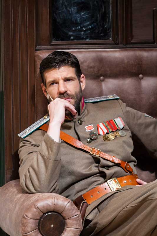 קשה לדמיין מחזה צ'כובי כוודוויל, אבל בהפקה הזו, לפחות בחלק הראשון שלה, התקרבו לזה. התזמורת הצבאית שמוזכרת במקור רק בסוף המערכה הרביעית, בנאומי הסיום של מאשה ושל אולגה, למרות שקצת לפני כן באותה מערכה היא מנגנת שיר לכת מאחורי הקלעים, יורדת לה בגרם המדרגות הימני של האולם כבר בהתחלה ומשם אל הבמה. תזמורת כלי נשיפה צבאית: שתי חצוצרות, טרומבון, קרן יער וכמובן טובה ותוף סנר. הם והחיילים האחרים המצויים במחזה, אמורים להעביר את אווירת מלוא החדר חיילים באחוזת פרוזורוב, ומכאן הגלישה לוודוויל טבעית. הנה המלכה ליא קניג בת ה-87 (!!) אפילו רוקדת עם שתי חיילים. אירינה גם היא רוקדת (שהרי הסיבה למסיבה היא היומולדת שלה). שני חיילים נוספים רוקדים ריקודי קוזקים. ורק מאשה יושבת על ספה וקוראת וגם שורקת כפי שכתוב (אבל טכנית, בלי התכוונות). אבל להבדיל משתי האחיות האחרות, כאן קשה לנו לשכוח שמדובר בגילה אלמגור. שוב גילה נופלת למלכודת של להיות גילה אלמגור ולא הדמות שהיא צריכה להיות. זה קורה לה לא מעט בשנים האחרונות. אמרו לי שבקוריולנוס זה לא קרה, אבל לא הזמינו אותי להצגה הזאת וזה מרגיז כי אני אוהבת שייקספיר. כמושא אהבתה של גילה, כלומר מאשה, ליהקו פה בתפקיד וירשינין את אלי גורנשטיין, שחקן ואמן רב-תחומי מצטיין לרוב, שאף פצח פה, במסגרת המחווה לוודוויל, בקטע סולו לצ'לו ('אגם הברברים' לצ'ייקובסקי, אם אני לא טועה, למה לא פירטו בתוכניה את הפסקול הפעם), וזאת כנראה כתחליף לכינור של אנדרי, כי רמי ברוך לא באמת מנגן כינור. אלי גבוה מאוד, גילה קטנטונת – לא האמנתי להם שהם מאוהבים, זה נראה כמו צמד חומה ומגדל של אלי גורנשטיין וצחי נוי הגוץ, אבל לא מצחיק בכלל, אלא מלאכותי ולא מתחבר, למשל בסצנת "האהבה ממבט ראשון" שניסו להנפיק לנו כאן בפגישתם הראשונה. ביחד ולחוד, גורנשטיין ואלמגור לא הצליחו לייצר דמויות משכנעות. ואז כאשר הציר המרכזי של המחזה לא מתפקד, בעצם אין מה שממש ידביק את החומרים בהצגה הזו. דב רייזר המצוין בתפקיד הבעל המקורנן של מאשה, קוליגין, משחק בעצם כנגד עצמו. והוא טוב מספיק כדי שזה יעמוד בפני עצמו, אבל לא הוא ולא גורנשטיין מהווים שידוך הולם לגילה המבוגרת מהם בהרבה, לא רק כרונולוגית, אלא גם איך שזה נראה על הבמה. כאשר היא פורצת בבכי קורע לב כשוירשינין עוזב עם היחידה את העיר, ואוחזת בו ומסרבת להרפות, אנו לא מרגישים כלום ממה שהיינו אמורים כנראה להרגיש: לא צער, לא חמלה, לא הזדהות, לא מועקה, רק מבוכה. ולא – זו לא מבוכה לנוכח אהבה של אנשים זקנים, זה בוודאי גם היה מביך אותנו, כי בראש המעוות שלנו האהבה שייכת לצעירים. אלא שפה לא היתה אהבה של אנשים זקנים. פה היתה אהבה של אנשים צעירים שאותם שיחקו אנשים זקנים. ואז בא קוליגין הרגיש והאוהב ואומר: "[במבוכה]: אין דבר, תבכה קצת, תבכה לה… משה הטובה שלי… משה היקרה שלי… את אשתי ואני מאושר, אם כך ואם כך… אינני מתלונן, אינני בא אלייך בשום תרעומת. הנה גם אוליה עדה… נתחיל לחיות שוב כמקודם ואני לא אגיד לך מילה אחת, אף לא רמז כלשהו…" (כל הציטוטים כאן בתרגום שלונסקי). ואנו מאמינים לו כי רייזר מיטיב להעביר את כל הגוונים של הדמות הזו, איש קטן ולא מרשים, קפדן, חסר רגישות (לכאורה), תמים (לכאורה) שזוכה ליחס מזלזל מצד כולם, בעיקר מצד אשתו, אבל בעצם הוא יודע הכול (ולא מראה זאת בשל מבוכה, או רגישות) וסולח ומקבל ותומך. אך זוהי רפליקה מנותקת. רגע צ'כובי שקיים מרייזר ועד רייזר ללא אינטראקציה עם הסצנה המביכה שקדמה לה, עם הצגת הראווה שנועדה בעיקר כדי לאפשר לשתי שחקניות גדולות להגיד אנחנו עדיין כאן וליתר השחקנים להדגים כישורים נוספים שמהנים ככל שיהיו, אינם ממש נחוצים כאן (גורנשטיין בצ'לו, דודינה בפסנתר. אצל צ'כוב זה בכלל כתוב אחרת). אנו משלימים פערים, מדמיינים איך זה היה צריך להראות בין וירשינין ומאשה. אנו לא צריכים לדמיין.