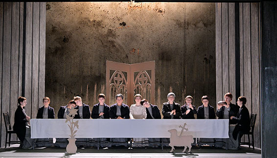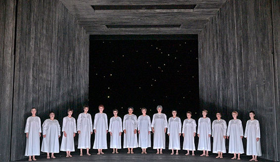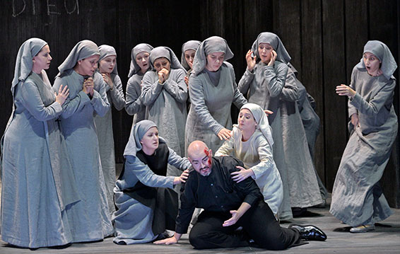 באופן מעניין, בהפקה זו ההמון הזועם בעת לידתה של בלאנש, עליו מספר האב, יען כי המהומות נמשכות כבר כ-19 שנה, הוצג כהמון גותי – צלליות שחורות, כסאות באוויר, מטאטאים מונפים, גלגלי כרכרה גדולים וחרבות שלופות… ואילו סצנת מות אם המנזר הייתה כבר חזון על טבעי… שבו הזמרת הושמה במיטה התלויה על הקיר האחורי של הבמה ואני באמת לא יכולה שלא לציין שזה מוכר לי מאיפשהו. הפואייה של בניין זה ממש, שנת 2000, עדינה בראון תלויה על מיטה שהורכבה על הקיר בעבודה באה מנוחה ליגע, במסגרת פסטיבל ערפול 2, ואני כתבתי את התוכנייה… (וגם כתבתי על העבודה הזו אחרי שנים רבות כשהוצגה שוב בפסטיבל ישראל במדור קלאסיקה ישראלית). אלא שכאן, הבחירה הזו הייתה חלק מהבחירה לשנות את זווית הראיה ולהציג את חדרה של אם המנזר בשעת מותה ממעוף ציפור, שבו צופות בלאנש והנזירות האחרות, שעומדות בקדמת הבמה, כאילו הן צופות בסרט, כאשר גם הרהיטים האחרים בחדר, בתוככי הבמה, הוצגו ממעוף הציפור.