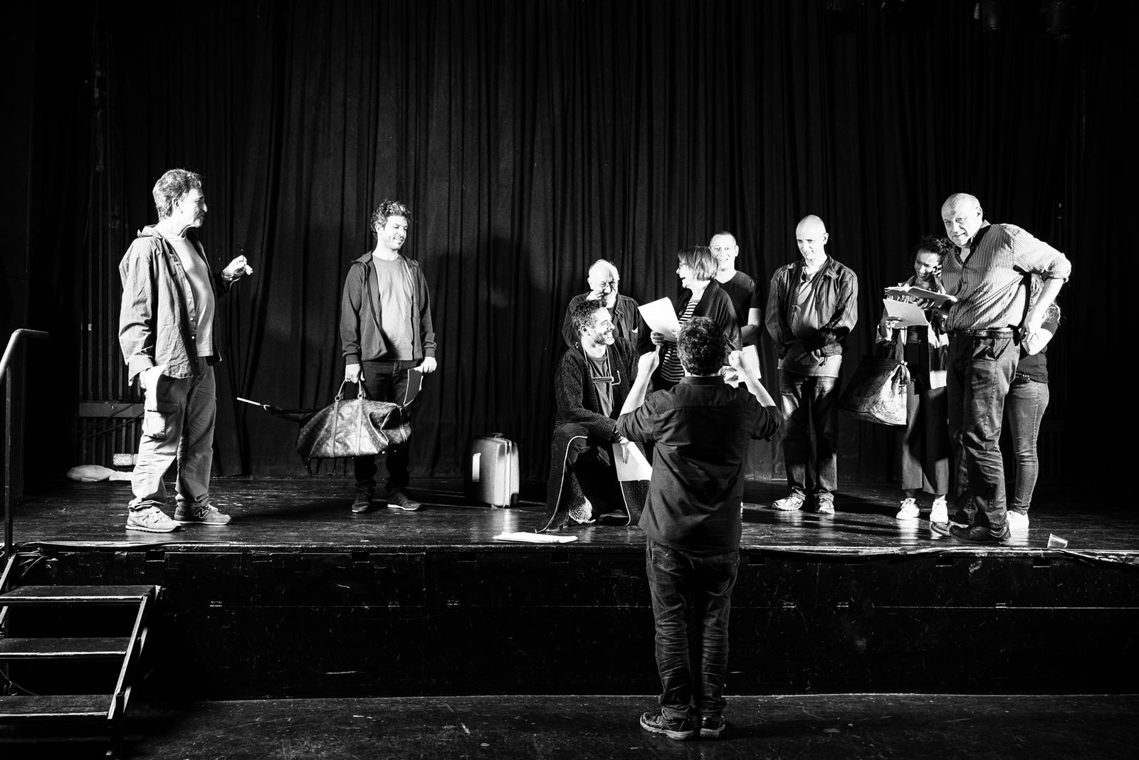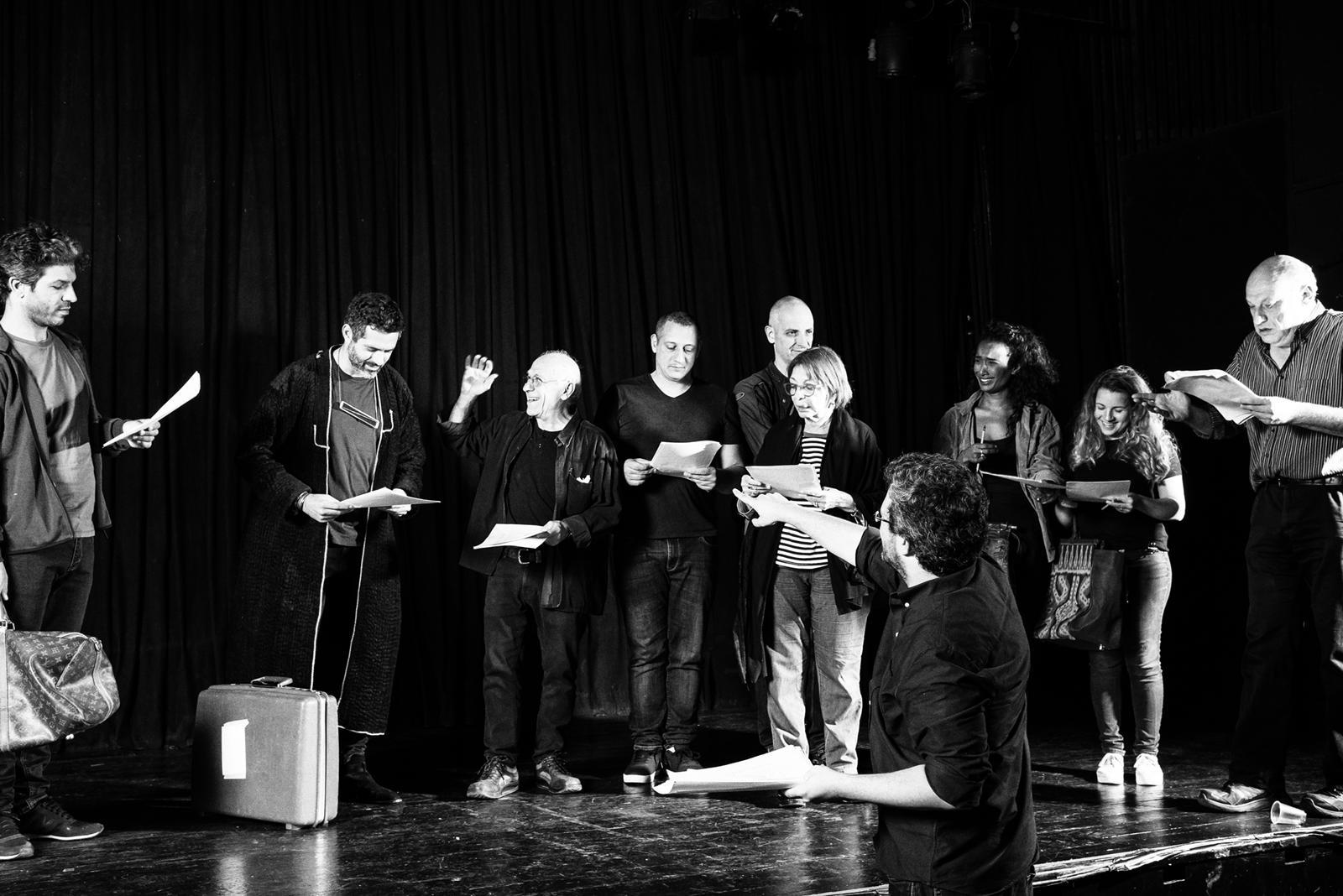 מרט מבקש ממני לכתוב כמה משפטים שאפשר יהיה לצטט. משהו על ההפקה הנוכחית. קשה לקרוא לזה הפקה של ממש. התפאורה מינימלית, התלבושות סמליות. השחקנים רובם ככולם עם טקסט בידיים. זוהי קריאה מבוימת. ובכל זאת קאסט מהטובים ביותר. עזרא דגן נמנה אפילו על הקאסט המקורי. רבים מהמשתתפים שחקני מרטתטרון, כלומר הופיעו בהפקות קודמות שלו. זה יותר פשוט לביים את מי שאתה מכיר. אבל נדמה שכל שחקן או שחקנית היה מוכן להיות חלק מההפקה הזו, להסתפק בתפקידון ורק לזכות להיות חלק מפלא. הפקה של מחזה של נסים אלוני, גם אם זו רק קריאה מבוימת לשישים וחמישה איש כל פעם בשתי הרצות בלבד. הם מוכנים לבוא להרבה יותר חזרות, מרט מספר על 25 חזרות במקום 3 שבדרך-כלל מוקצות לקריאה מבוימת. זה מאפשר קריאה מבוימת שהיא יותר מבוימת מקריאה. והמוכנות הזו, הביאה לליהוק מדויק שבו כל שחקן פשוט מתאים כמו כפפה לדמות שאותה הוא אמור לגלם. רבקה מיכאלי בתפקיד מלכת אנגליה. שהיא גם אחת ממלכות התיאטרון הישראלי. וגם אחת ממלכות הטלוויזיה. כאן היא רק צופה בה… ועדיין, ההיסטוריה הסאטירית שלה, צובעת את התפקיד הזה בדיוק בגוון שאני חושבת שאלוני היה חפץ בו. שחקן שמביא את ההיסטוריה שלו לתפקיד והיא מעצימה את הדמות, ככה זה כשמדברים על זיכרון. על הצגה וחיים. הכול מתערבב, כמו אצל אלוני. דן שפירא, שכבר שיתף פעולה עם מרט בהצגה אפשר לעשות את זה משהו, הוא הגיבן, יש לו גיבנת קבועה. כמה סמלי, שמי שהרבה פעמים קיבל ביקורת על כך שהוא אינו יכול להפסיק להיות דן שפירא בתוך הדמות שלו, הנה מראה את הגיבנת שהוא אינו יכול להשתחרר ממנה. ופה זו הדמות וזה עובד. אוהד שחר, היה המלך בהפקת הנסיכה האמריקאית (חוזרת) של מרט וכאן הוא שוב המלך המודח, הרוטן, שמחליף את שמו. רודיה קוזלובסקי, היה הגולם בהפקה של מרט הגולם חי! וכאן הוא רוצח שכיר שפועל כגולם, כמכונה. לפי הוראות, או ללא הוראות, אבל מתוך אינרציה. מכניות. רועי אסף הוורסטלי, שפעם הוא שוטר מעונה בקולנוע (זוכה פרס אופיר, מבין שניים) ופעם ראש הטקס בהצגת הפרינג' של השנה שעברה, בורדל טוטאל, רושם כאן עוד תפקיד טוטאלי לארנסל התפקידים שלו. דודו גולן, מאנסמבל ציפורלה, נונסנס וספלסטיק, מגלם פה את ישו נונסנס וסלפסטיק. ערן שראל הוא אוסקר מושלם ודנה מיינרט, פעם אנה פרנק מלאת פאתוס, בדמות שכולה קרקס על פאתוס (ובחן רב). והערה על זוג שחקנים מיוחד ומרגש שגילם את ביאטו ואת פרנץ. עזרא דגן הוא ביאטו בתפקיד שנכתב במיוחד בשבילו לפני 30 שנה. שמבוסס על אישיותו, על חיתוך הדיבור שלו, שעושה שימוש בכישורי הפנטומימה שלו. ועימו מי שלרוב משמש כפרופ' לתיאטרון וכמתרגם של מחזות, גד קינר, למרות שבמקור הוא שחקן (מהאנסמבל המקורי של את ואני והמלחמה הבאה של חנוך לוין, וכבר עבד עם מרט בעבר, בהצגה 1948 ובהצגה הגולם חי!). שניהם היו ביחד לפני 50 שנה בצוות הווי גייסות השריון. והנה הם נפגשים כאן שוב. ערך מוסף. כבר אמרנו. ואולי הרגע המרגש מכל, ההשתחוויה כמובן, כל השחקנים ותמונה אחת גדולה של מי שכבר לא איתנו ואיתנו יותר מכל, נסים אלוני. שבחייו לא זכה ואנו מקווים שמהשמיים הוא מביט בנו מרוצה… טוב, בטח הוא רוצה להחליף כבר כמה משפטים… אני מזילה דמעה. אין ספק שזהו רגע היסטורי. ככה חוגגים יום הולדת.
